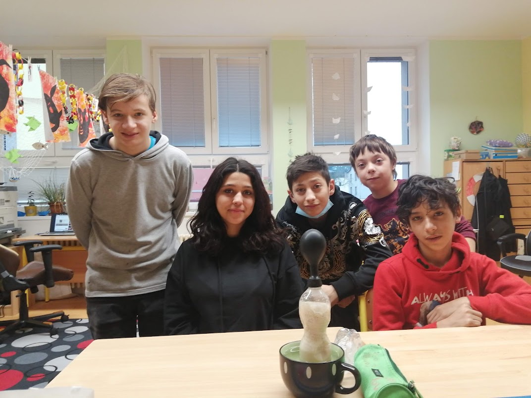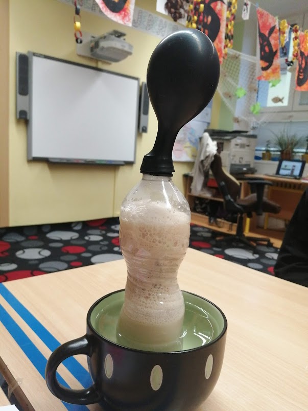 Kvasinky - ukázali jsme si proces kvašení - co umí kvasnice - nejdříve jsme pomocí droždí nafoukli balónek. Druhý pokus jsme zadělali kvásek - kynuté těsto na pizzu. Pizzu jsme si dokonce upekli a snědli. Ňam, ňam.